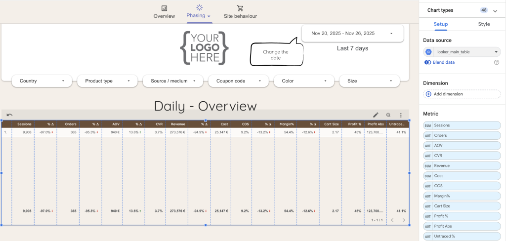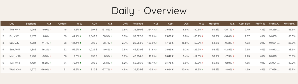 This example is an ecommerce business. So we’ll always need to keep a really good look at things like traffic, conversion rate, avg order value, revenue, marketing costs, margins, profits, how many orders that are untraced in GA4 and so on.