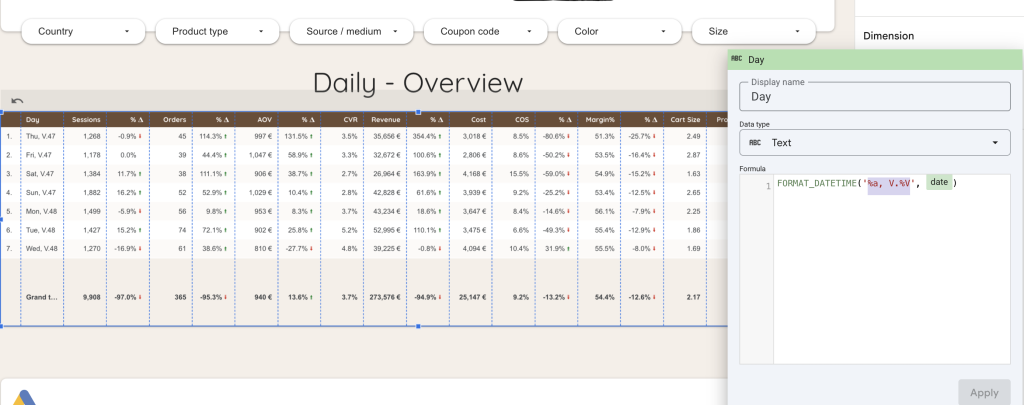 This is where much of the magic comes. By formatting our DATE field in a certain way ( {Week number} {Week day}, when we later add the comparison period, Looker Studio will look at our dimension and compare with the matching row last year. So already here, we kind of have the solution done.